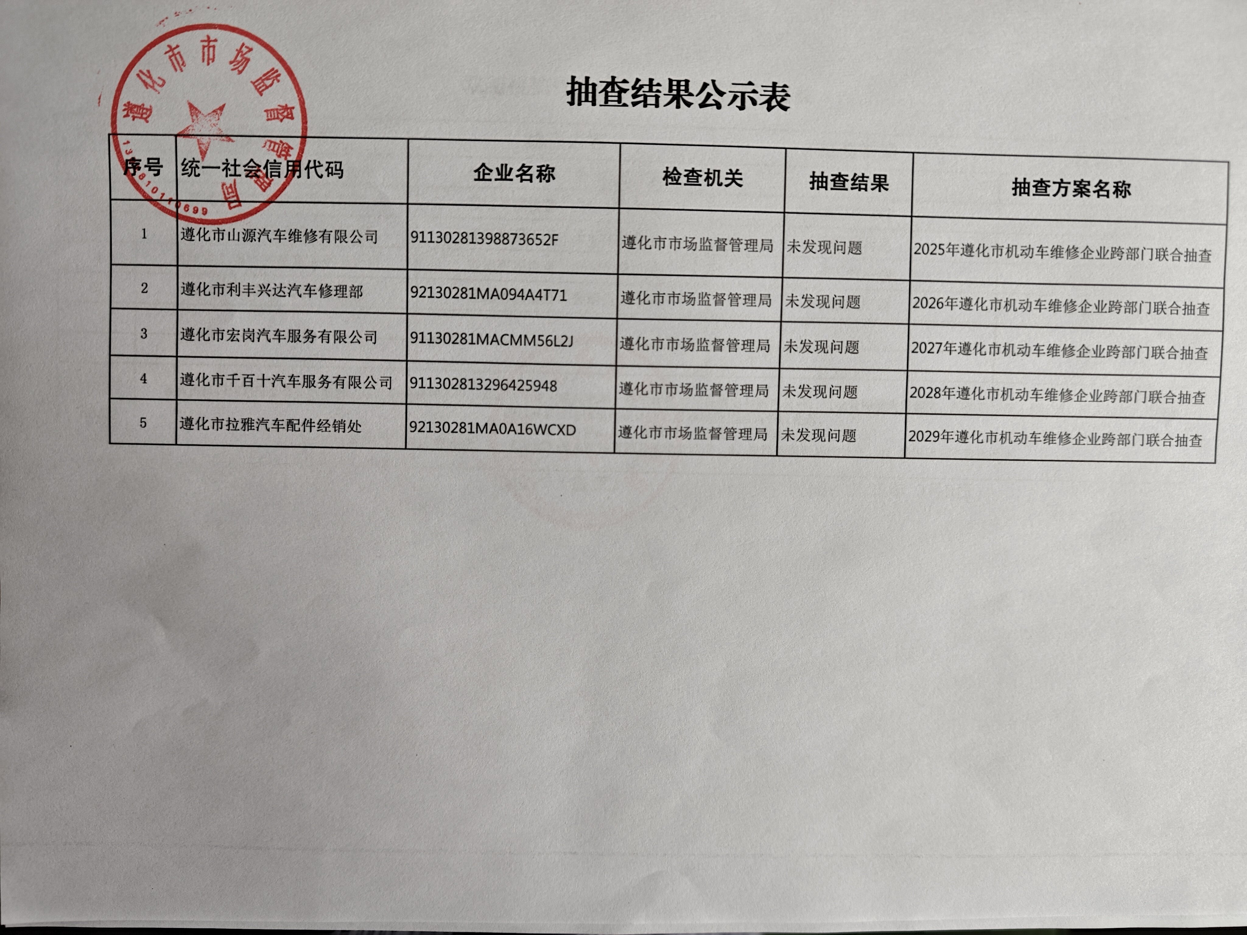 2025年遵化市机动车维修企业跨部门联合抽查结果公示