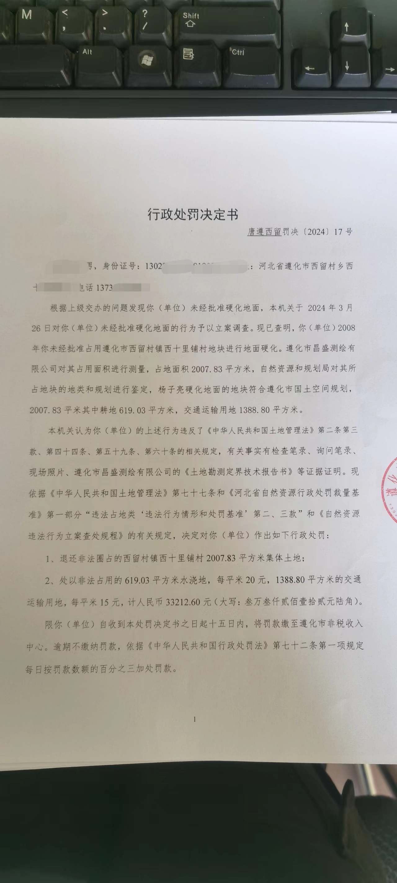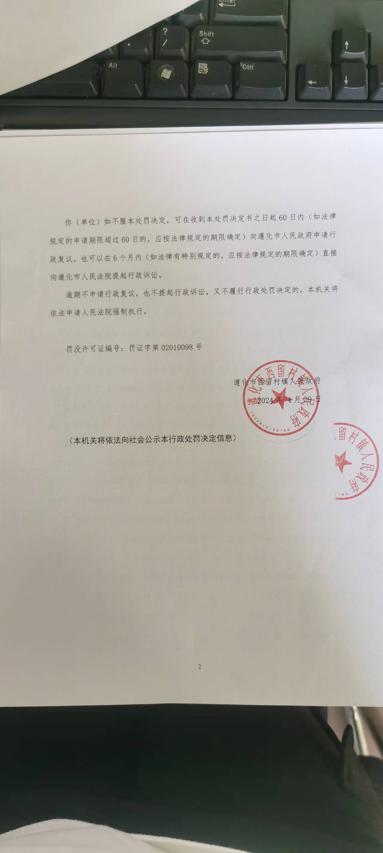 行政处罚决定书唐遵西留罚决[2024]17号